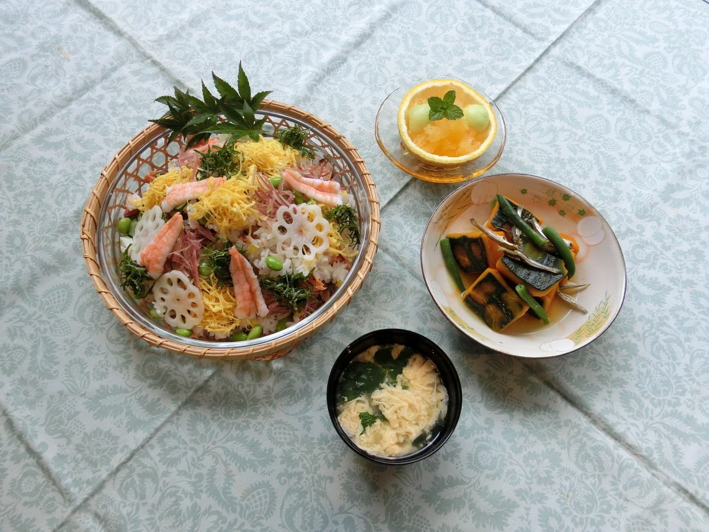 第11回のリフレッシュお料理教室は「我が家で楽しく♪お寿司の日」をテーマに、さわやか夏ちらし寿司、鶏そぼろ稲荷、三つ葉のかきたま汁、かぼちゃのいりこ煮、甘夏のフルーツゼリーの5品。なんて豪華!