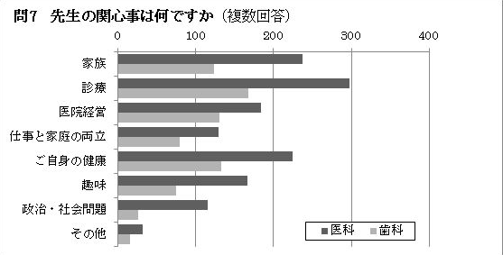関心事(複数回答)は、「診療」72.8%、「家族」56.4%、「自身の健康」55.9%、「医院経営」49.4%の順に多かった。