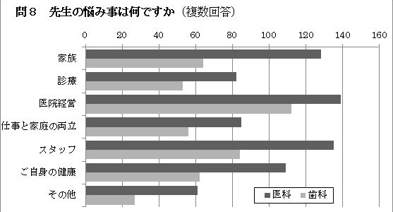 一方、悩み(同)は「医院経営」が最も多く39.3%、次いで「スタッフ」34.3%、「家族」30.1%、「自身の健康」26.7%となった。