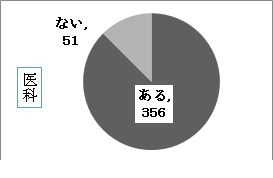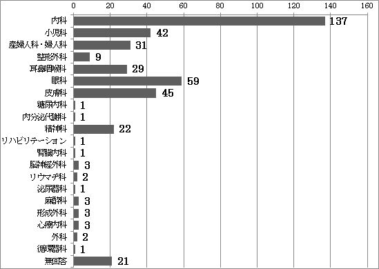 医科の主な診療科は、内科が32.9%を占め、次いで眼科14.1%、皮膚科10.8%、小児科10.1%、産婦人科・婦人科7.4%、耳鼻咽喉科7.0%となり、6科で全体の8割を占める。
