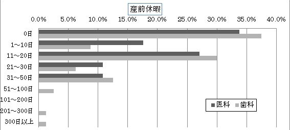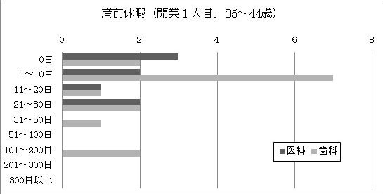 年齢別に見ると、35歳~44歳の1人目産前休暇は「0日」5件(医科3、歯科2)、「1~10日」が最多の9件(医科、歯科7)。