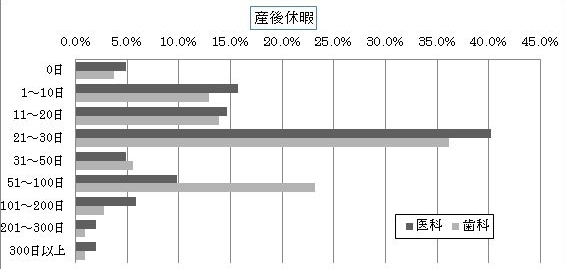 これに対し、医科77件(75.5%)、歯科72件(66.7%)、計149件(71.0%)が産後休暇30日以下だった。