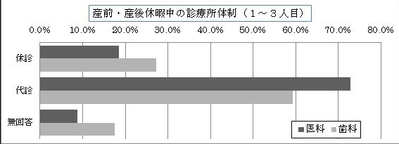 産前・産後休暇中の診療体制は、開業後1~3人目とも6~7割が代診で対応し、総件数では「代診」が医科75件(72.8%)、歯科61件(59.2%)、「休診」は医科19件(18.4%)、歯科28件(27.2%)だった。