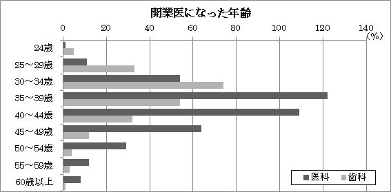 開業医になった年齢は「35~39歳」が178件(27.6%)で最も多く、次いで「40~44歳」142件(22.0%)、「30~34歳」128件(19.9%)。医科歯科別に見ると、医科では「35~39歳」が122件(29.8%)で最も多く、「40~44歳」109件(26.6%)、「45~49歳」64件(15.6%)、「30~34歳」54件(13.2%)の順。歯科では「30~34歳」74件(33.9%)が最多で、「35~39歳」54件(24.8%)、「25~29歳」33件(15.1%)、「40~44歳」32件(14.7%)の順に多く、歯科の方が開業年齢が低い傾向がみられた。