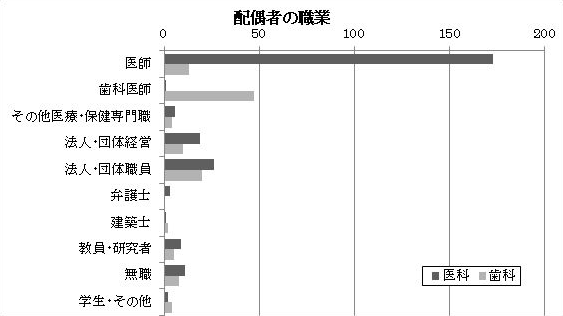 配偶者は「有」64.0%で、うち配偶者の職業は「医師」45.1%、「歯科医師」11.9%と、合わせて半数以上を占め、医科では173件、歯科では47件が同業者だった。