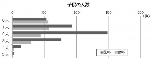子どもの人数は「2人」194件(30.1%)、「1人」150件(23.3%)、「2人」110件(17.1%)、「3人」105件(16.3%)の順(n=644、無回答63件)。医科・歯科別に見ると、医科(n=417)では「2人」148件(35.5%)、「1人」93件(22.3%)、「3人」76件(18.2%)の順。歯科(n=224)は「1人」57件(25.4%)、「0人」(25.0%)、「2人」44件「19.6%)の順で、医科の方が子供の数が多い傾向が見られた。45歳未満では、医科は「2人」14件(31.8%)、「1人」13件(29.5%)、「0人」7件(15.9%)の順で、「3人」も5件あった。同歯科は「1人」16件(26.7%)、「0人」20件(33.3%)、「1人」16件(26.7%)の順だった。