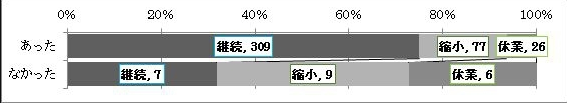 子育て支援の有無で見ると、子育て支援があった(ある)場合は「縮小」18.7%、「休業」6.3%にとどまっているのに対し、なかった(ない)場合は「縮小」40.9%、「休業」27.3%に上る。
